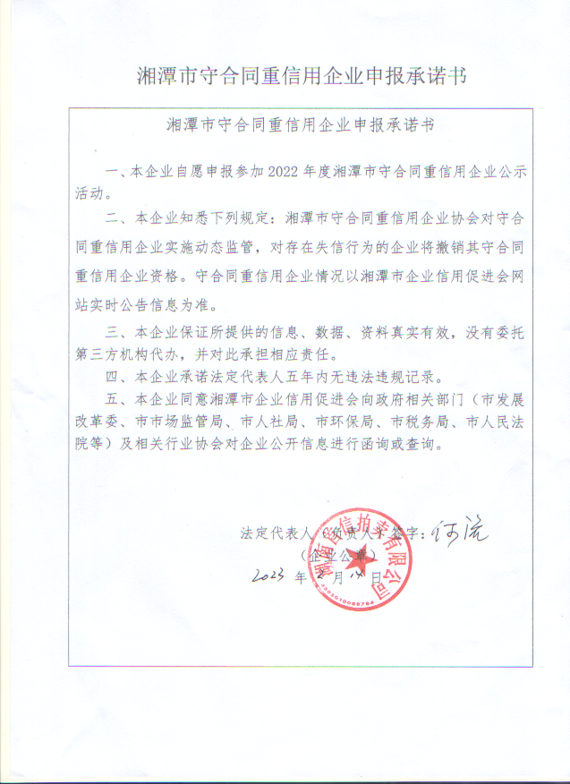 本企業(yè)根據(jù)《湘潭市守合同重信用企業(yè)申報規(guī)定》等編制 2022 年度企業(yè)信用報告書,并保證本報告書內(nèi)容真實、準(zhǔn)確、完整。