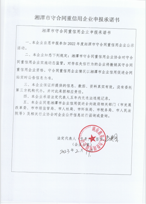 本企業(yè)根據(jù)《湘潭市守合同重信用企業(yè)申報(bào)規(guī)定》等編制 2022 年度企業(yè)信用報(bào)告書,并保證本報(bào)告書內(nèi)容真實(shí)、準(zhǔn)確、完整。