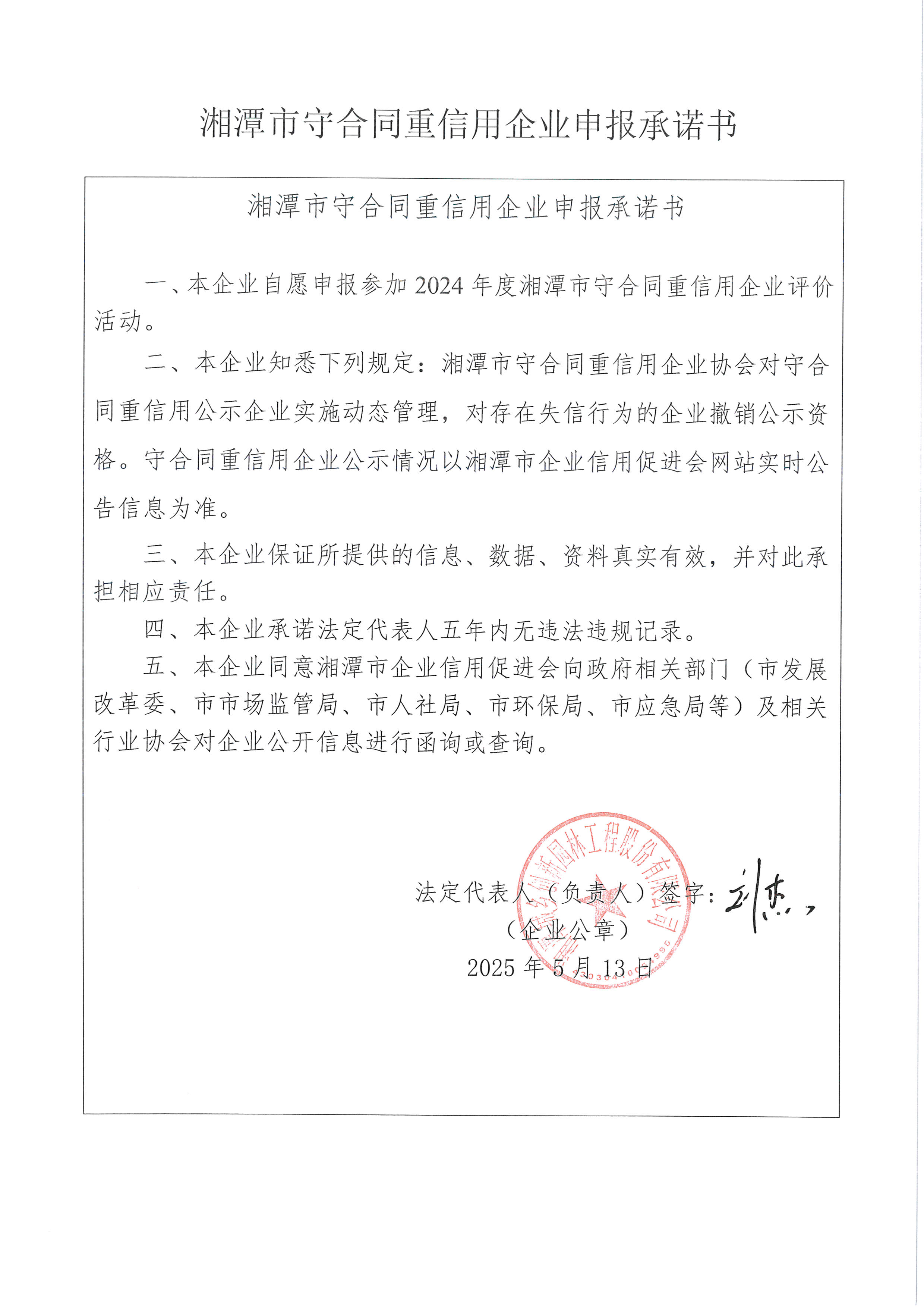 本企業(yè)根據(jù)《湘潭市守合同重信用企業(yè)申報(bào)規(guī)定》等編制 2024 年度企業(yè)信用報(bào)告書(shū),并保證本報(bào)告書(shū)內(nèi)容真實(shí)、準(zhǔn)確、完整。